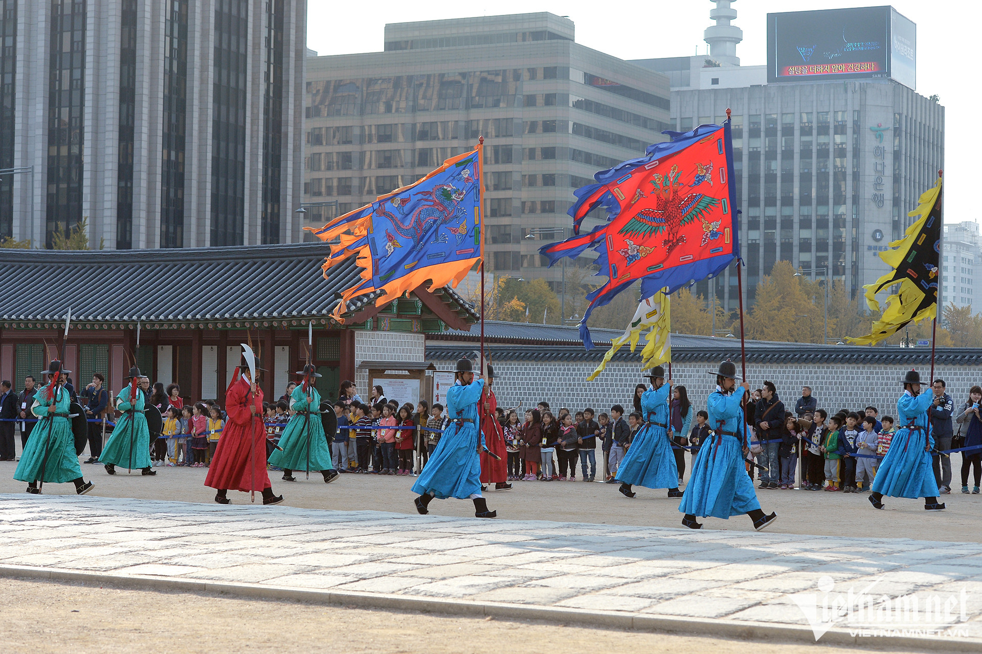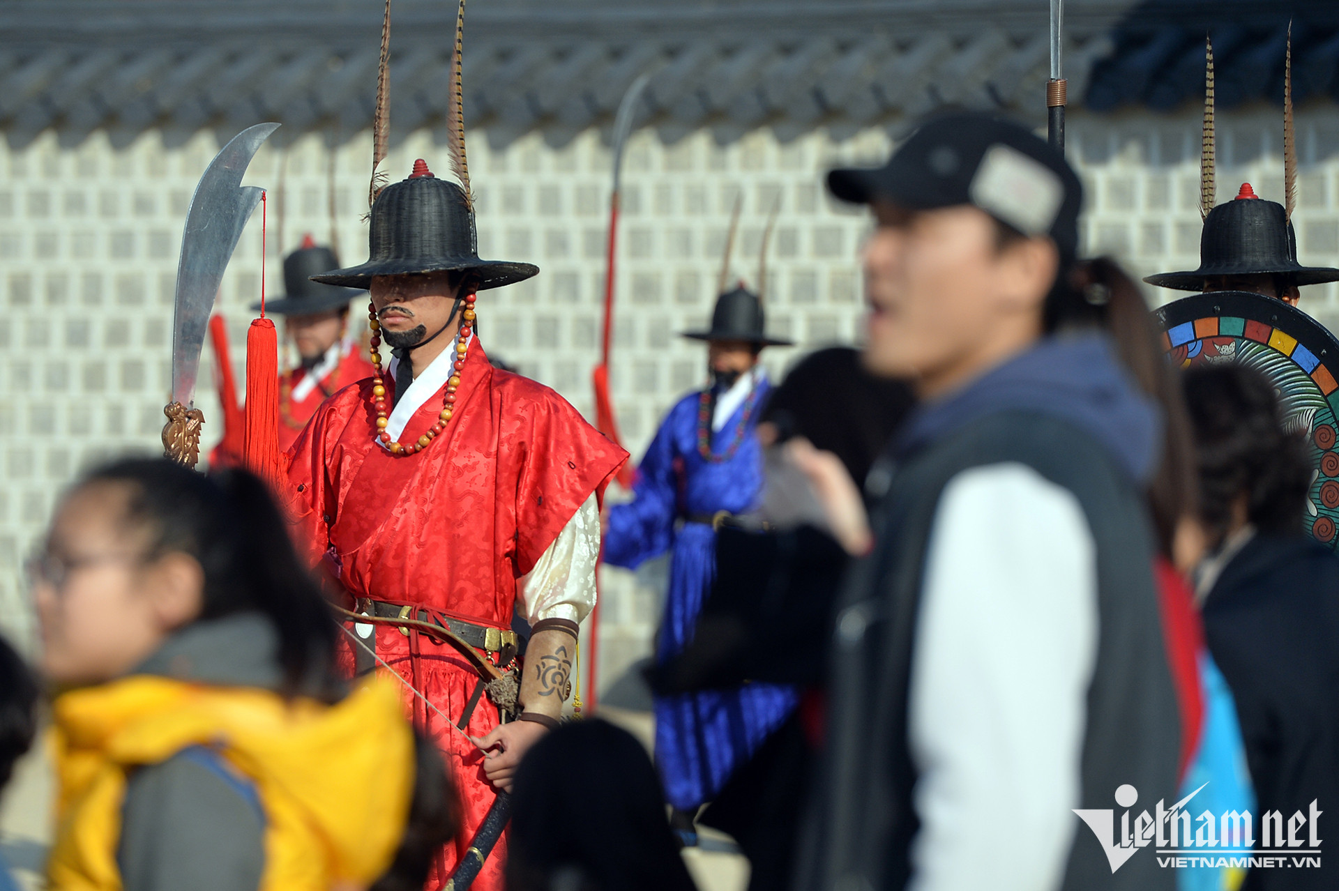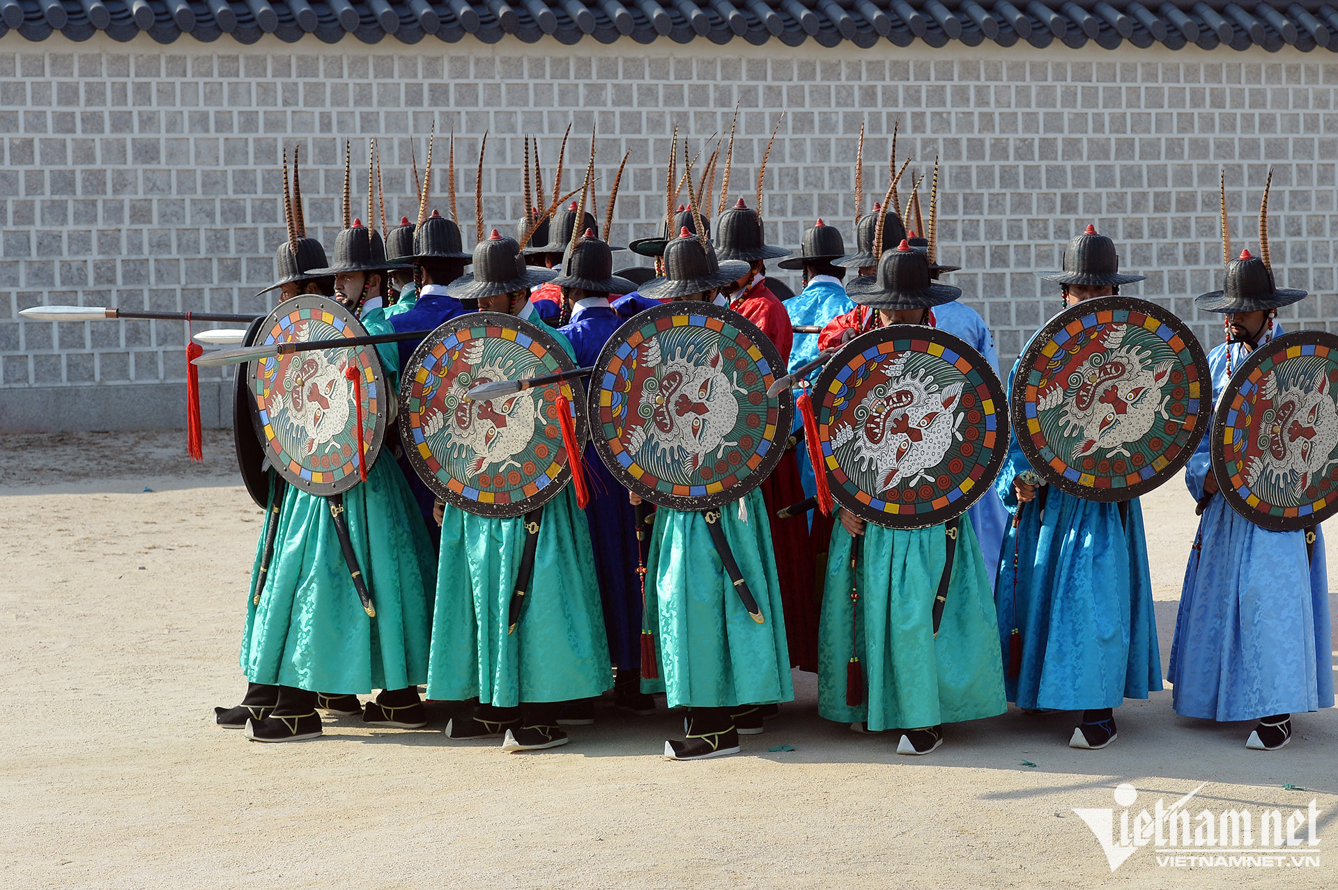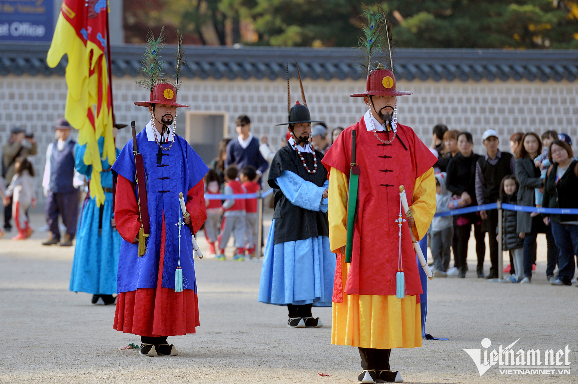 Lính canh Hoàng gia mặc phục trang giống như thời Joseon bước ra từ phía sau của cung. Du khách có thể phân biệt tướng và lính qua trang phục. Trong ảnh, vị trấn tướng đội mũ đỏ luôn đứng trong tư thế oai nghiêm, mắt nhìn thẳng về phía trước, chỉ cử động khi cần đi lại để chỉ đạo.