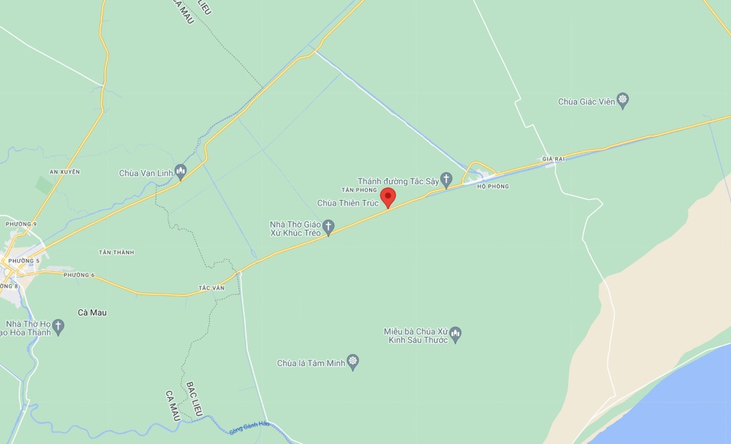 Chùa Thiên Trúc nằm tại địa phận xã Tân Phong, thị xã Giá Rai, tỉnh Bạc Liêu. Ảnh: Google Maps.
