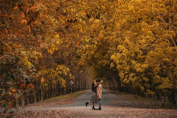 Những ngọn cây cao vút tận trời, kéo dài tít tắp trên thảm lá vàng êm ái tạo nên khung cảnh vô cùng lãng mạn. Mỗi khi có gió thổi lá trên cây lại rơi rụng lả tả tạo thành một thảm lá vàng đẹp mắt dưới mặt đất.