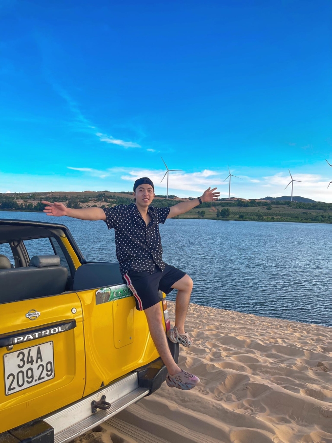 Quế Anh trong chuyến du lịch Mũi Né. Ảnh: NVCC Quế Anh kể lại, nơi anh gặp sự cố cách điểm du lịch đồi cát khoảng hơn 10 km. Rất ít chỗ quay đầu, thường xuất hiện bãi cát nhỏ cắt ngang hai làn đường. Do phải đi rất xa mới đến chỗ quay đầu, phần vì thấy có vết bánh xe đi qua và bạn bè trên xe nhiệt tình nói qua được, Quế Anh chủ quan và lái theo. Kết quả, xe bị lún cát, không thể tiếp tục di chuyển. Lần đầu gặp sự cố như vậy, Quế Anh luống cuống. Sau đó, cả xe 5 người xuống đẩy và đào cát chèn bánh.