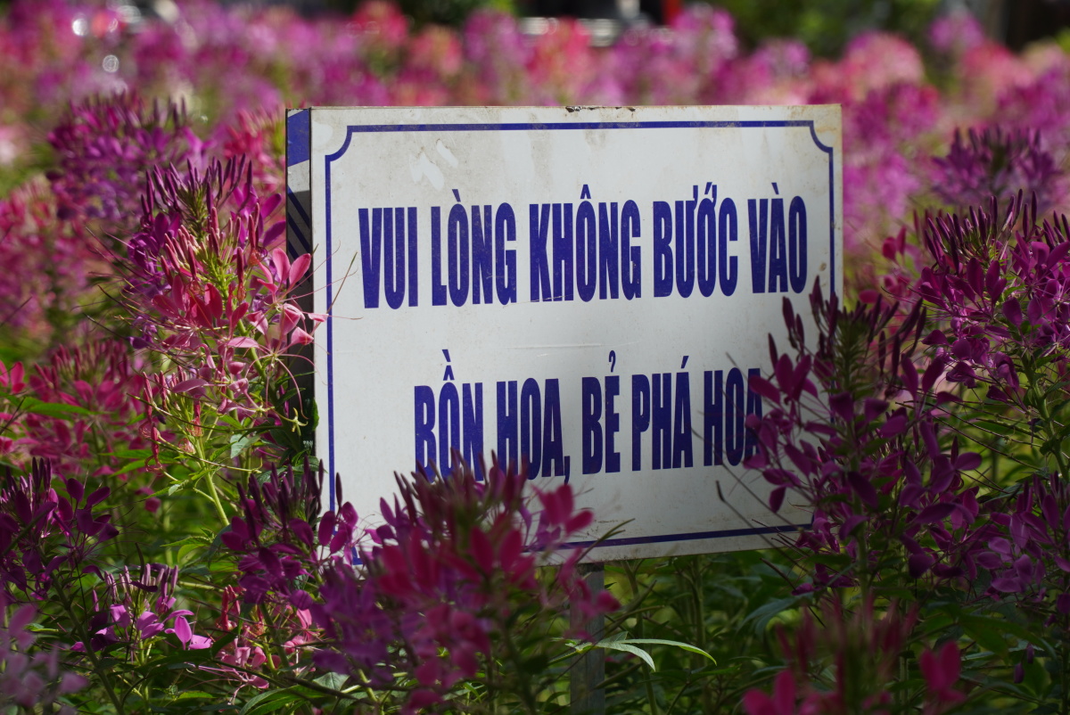 Ban quản lý vườn hoa cắm bảng yêu cầu du khách không vào trong bồn hoa bẻ, phá hoại.