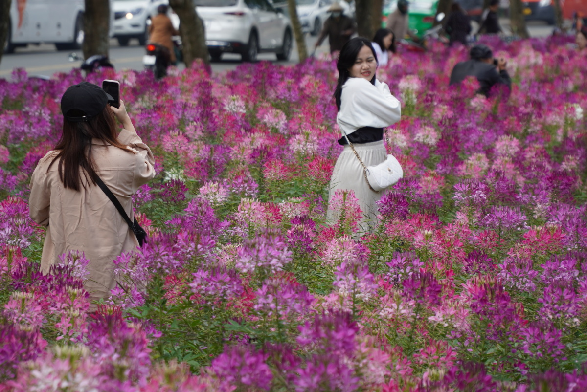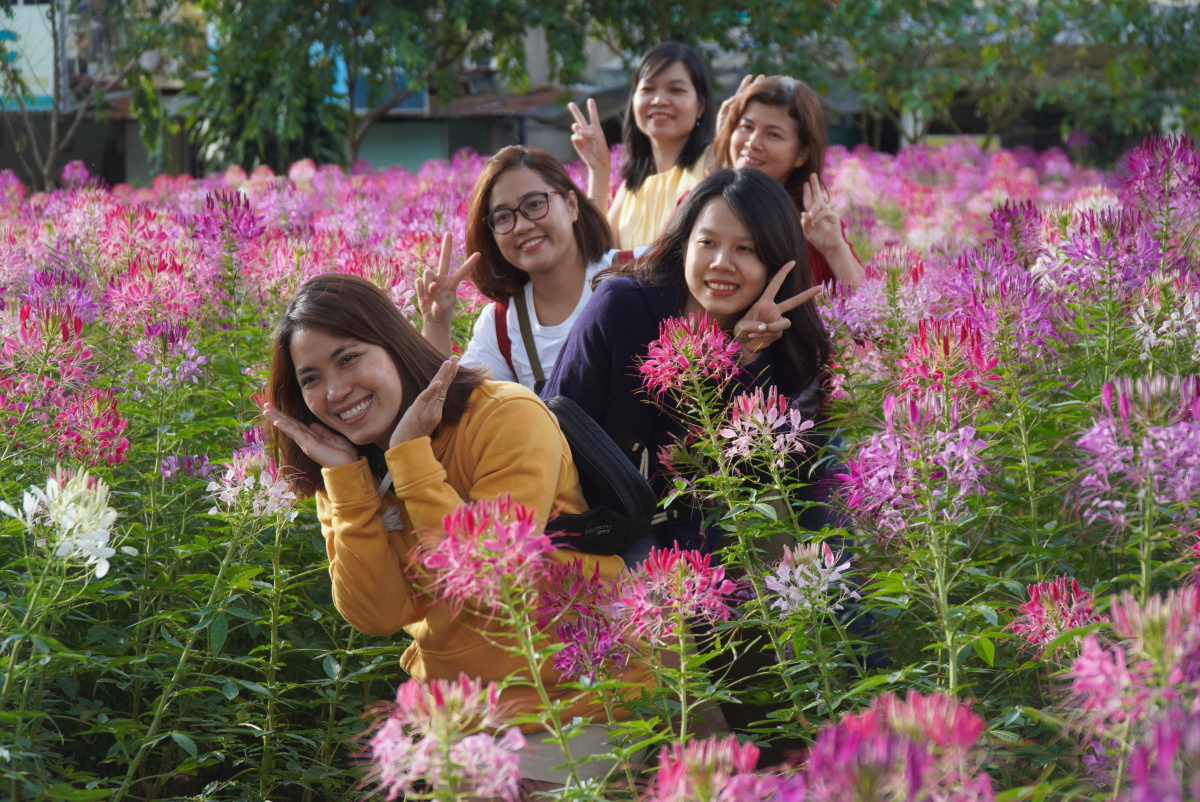 Nhóm bạn nữ từ TP HCM đến Đà Lạt du lịch, đi ngang trung tâm thấy vườn hoa liền ghé vào chụp ảnh làm kỷ niệm chuyến đi phố núi. "Em thấy hoa đẹp quá, đặc biệt đủ màu hồng, trắng, tím... cả nhóm ai cũng thích thú", một bạn nữ nói.