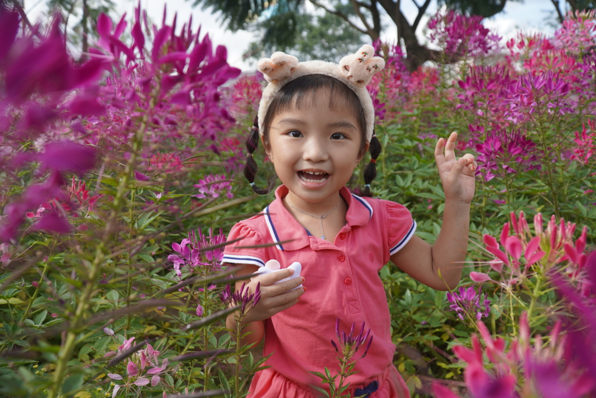 Bé Chíp (TP HCM) thích thú với vườn hoa khoe sắc rực rỡ, tươi cười khi được mẹ đưa máy điện thoại chụp ảnh. "Con thích màu tím và hồng của hoa vì nó đẹp. Ở vườn nhà có vườn hoa này thì thích lắm", bé Chíp nói với mẹ.
