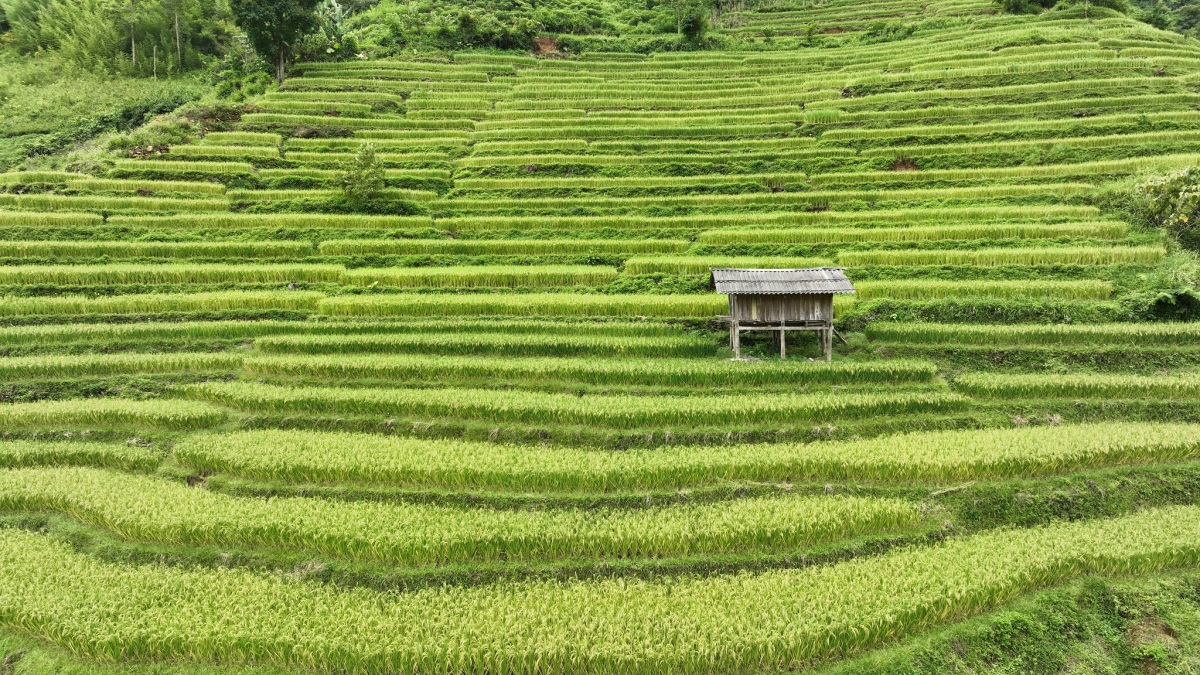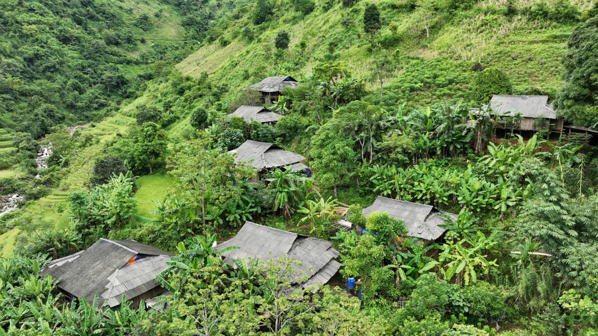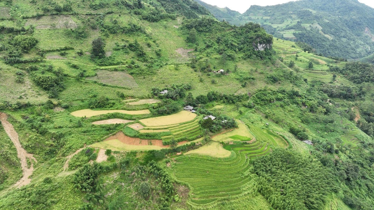 Nếp nhà yên bình trên ruộng bậc thang tại xã Hưng Đạo. Ngoài ngắm lúa, dọc đường đi trên Bảo Lạc, Việt còn thấy nhiều hàng trúc sào hai bên đường và tò mò quay lại video cảnh người nông dân thu hoạch trúc.
