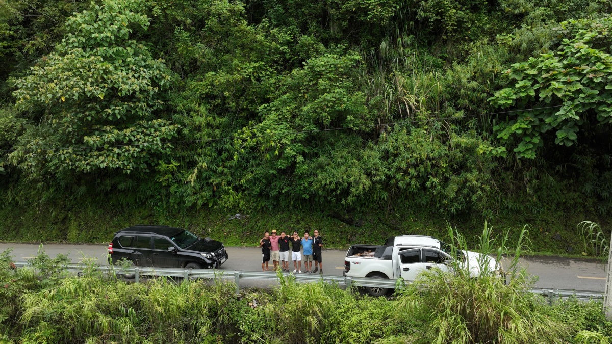 Chu Đức Việt (trái) cùng nhóm bạn check-in bằng flycam trên đoạn đường tới xã Hưng Đạo, huyện Bảo Lạc. Hành trình dự kiến hạ trại đón trăng rằm Trung thu. Nhưng khi cả nhóm khi đến Bảo Lạc thì trời mưa to. “Trước khi lên lịch tới Cao Bằng, chúng tôi đã xem thời tiết nên tâm lý cũng không ảnh hưởng khi mưa, không thể hạ trại", anh nói.
