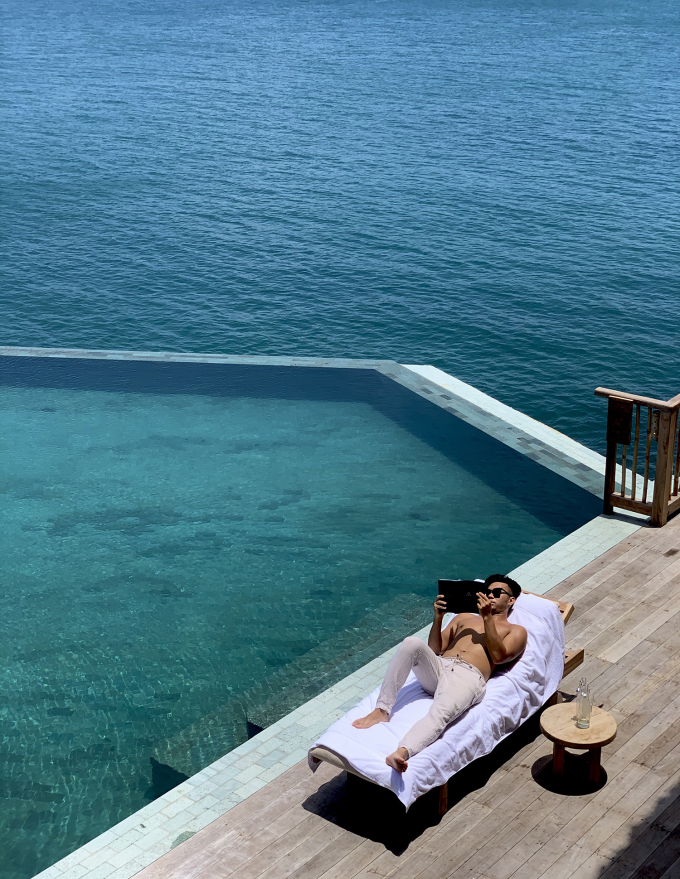 Hiếu đọc sách trong phòng hạng tổng thống ở Six Senses Ninh Van Bay.Sắp tới, Hiếu dự định tiếp tục trải nghiệm resort Amanoi Ninh Thuận và tích tiền để du lịch nước ngoài. Giá hạng phòng Tổng thống ở đây được anh chia sẻ là 128 triệu đồng một đêm.