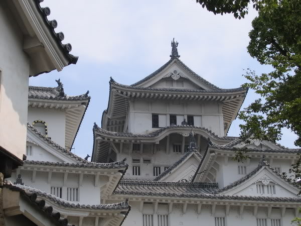 Một đoạn hành lang của lâu đài HimejiToà thành Himeji đặc biệt nổi bật với những mái ngói màu bạc kết hợp cùng màu trắng của tường thành. Lâu đài này có đến 56 loại ngói, rìa phần mái sử dụng các loại miếng ngói nhỏ hình tam giác vô cùng độc đáo có tác dụng giúp nước mưa chảy xuống rãnh phía dưới và đi vào bộ lọc nước cho việc ăn uống và sinh hoạt.