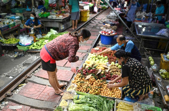Họp chợ và mua bán ngay trên đường ray tàu hỏa. Ảnh: AFPVà chợ đường tàu Mae Klong là nơi thu hút rất đông khách Trung Quốc tới mua sầu riêng.