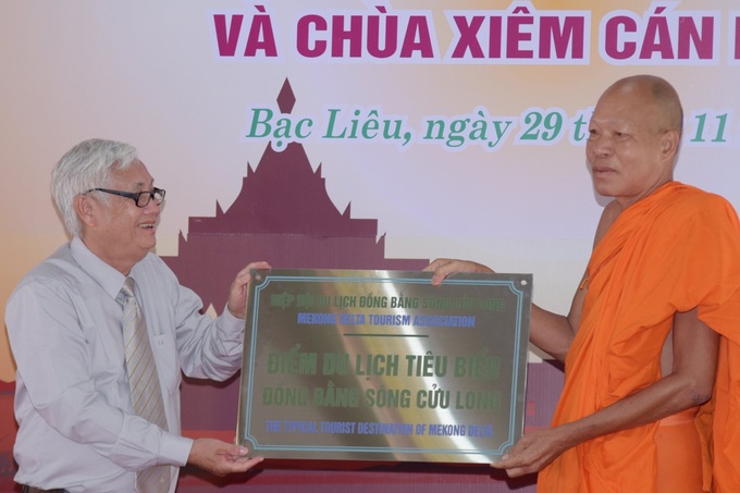 Đại diện Hiệp hội Du lịch ĐBSCL trao công nhận chùa Xiêm Cán (TP Bạc Liêu) trở thành điểm du lịch tiêu biểu ĐBSCL đến trụ trì chùa (Ảnh: HH). Chùa Xiêm Cán tọa lạc vùng ven biển xã Vĩnh Trạch Đông (TP Bạc Liêu, tỉnh Bạc Liêu), cách trung tâm thành phố khoảng 12km. Chùa được khởi công xây dựng vào năm 1887.