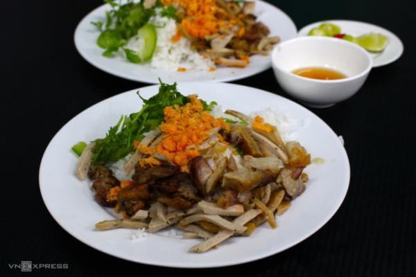 Lần đầu đến quán, bạn có thể thử ăn cơm "âm phủ" (cơm thập cẩm) với 5 nguyên liệu khác nhau như thịt heo quay, thịt nướng, chả, tôm cháy, dưa leo bóp. Cơm đựng trong đĩa đầy đặn, khách chan nước mắm mặn vào cơm và trộn đều thưởng thức.