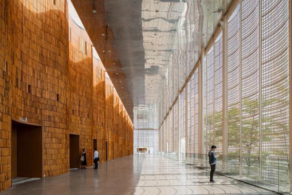 Điều này cũng khiến cho kết cấu trước đó từ nặng nề biến chuyển thành các lớp lang nhịp nhàng, uyển chuyển bởi thiết kế bao bọc phần đóng của công trình được tạo ra từ lớp vỏ bao che với vật liệu lưới thép cong màu trắng, được đục lỗ hoa văn cho phép nắng len lỏi vào bên trong.