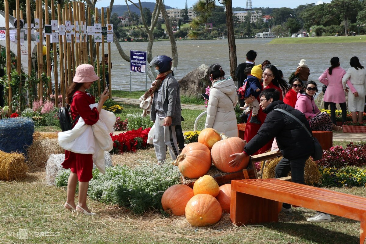 Ngoài hoa, nhiều sản phẩm nông sản ở Đà Lạt cũng được trưng bày đan xen với hoa, thu hút nhiều du khách. Trong ảnh du khách chụp ảnh với quả bí đỏ khổng lồ.