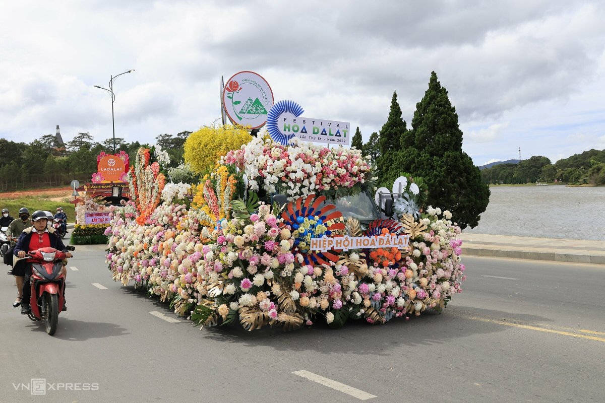 Xe hoa diễu hành trên trung tâm TP Đà Lạt chiều 17/12. Mỗi xe hoa được trang trí từ hàng chục loại hoa tươi khác nhau, chủ yếu là các loài hoa đặc trưng của các làng hoa trên địa bàn như lily, cúc, cẩm chướng, hồng,…