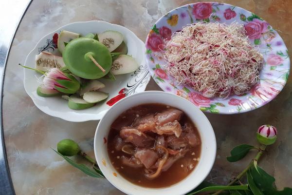 Hoa và trái chấm mắm cá mề gàNgồi trên thuyền lướt ra cửa biển đón hoàng hôn và trong lúc mặt trời chuẩn bị tỏa ráng chiều vàng trước khi lặn, ghé vào bãi bần cổ thụ hái trái bần non và hoa bần vừa nở, không phải nụ mà cũng không phải mãn khai, mang vào bếp, rửa sạch , trái thì xắt lát mỏng, hoa thì tẻ nhỏ ra rồi chấm mắm mề gà.