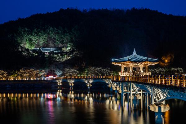 Toàn cảnh cây cầu WoryeongCây cầu Woryeong chính là sân khấu chính của lễ hội, với chiều dài 387m, chiều rộng 3,6m, đây được coi là cây cầu gỗ dài nhất tại Hàn Quốc. Ngay cả vào những ngày bình thường, mỗi khi màn đêm buông xuống, ánh đèn lấp lánh cùng những cảnh quan tô điểm cho nơi đây đều trở nên rực rỡ đến lạ và dần dà nơi đây trở thành một điểm đến nổi tiếng với du khách trên cả nước.