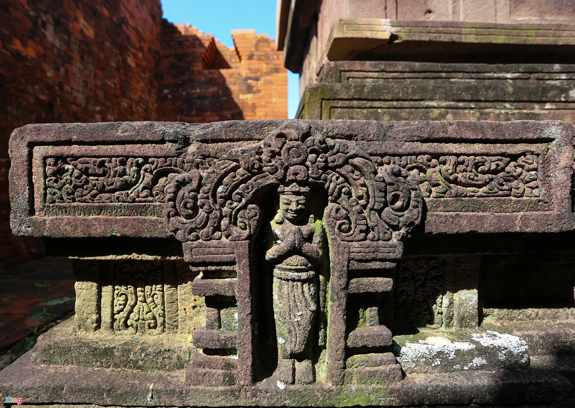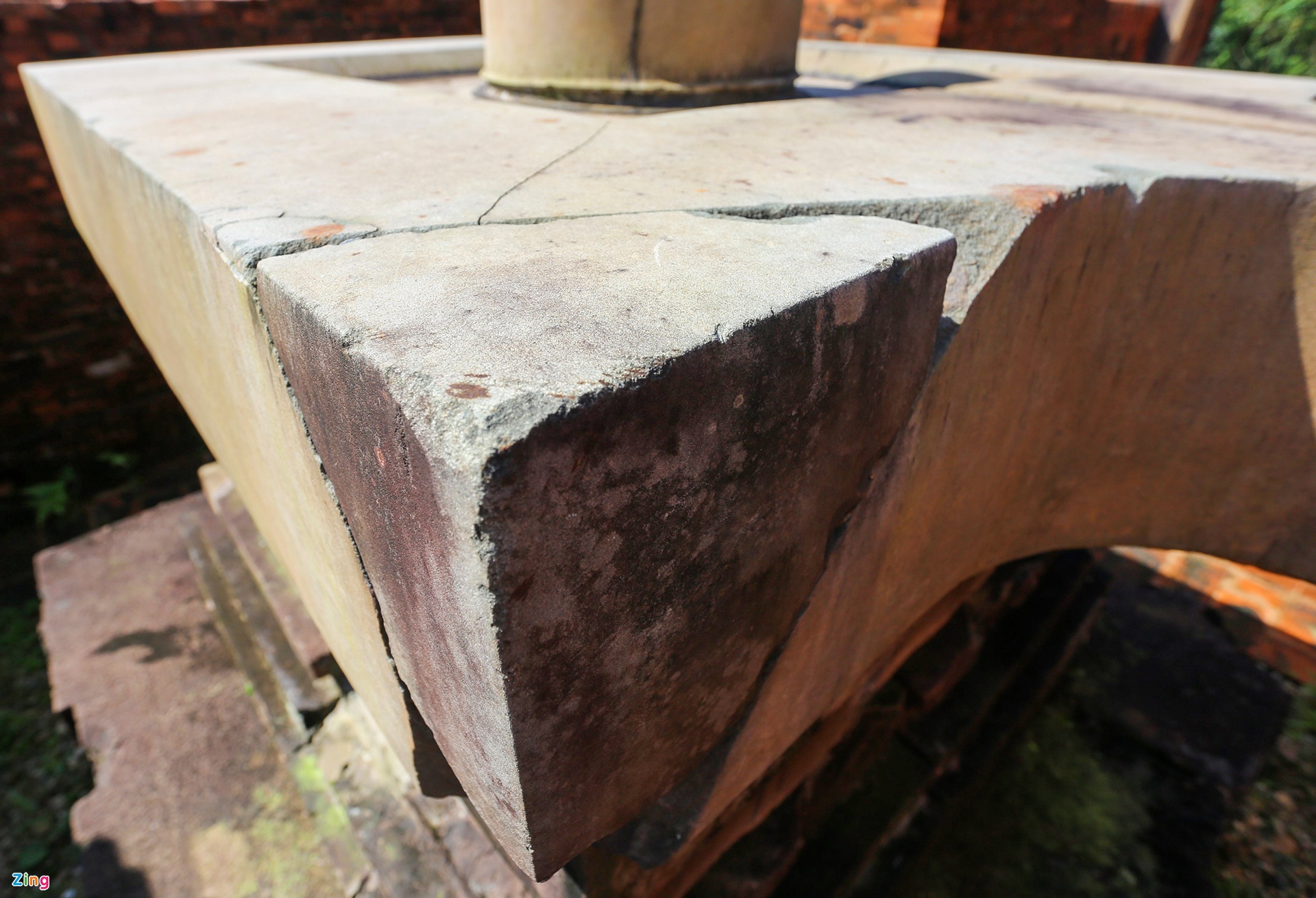 Đài thờ sa thạch với Linga -Yoni còn khá nguyên vẹn, một vài vị trí ở phần đế, thân bị nứt vỡ.