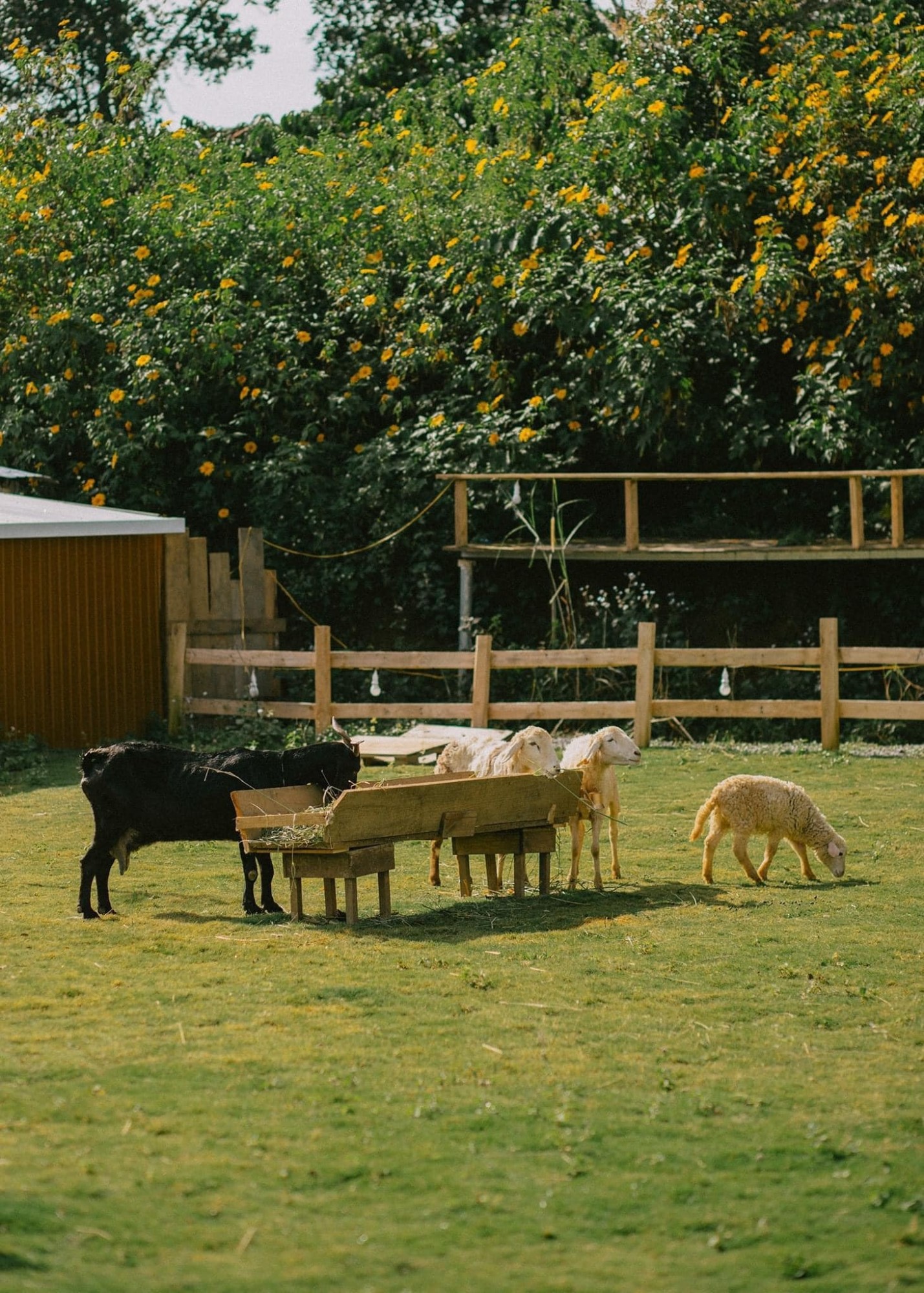 Căn nhà màu nâu và chuồng nuôi các động vật như chó, cừu, dê với hàng rào gỗ nằm ở phía cuối nông trại. Các loài động vật luôn được vệ sinh sạch sẽ hàng tuần nên bạn có thể thoải mái chơi đùa cùng chúng.