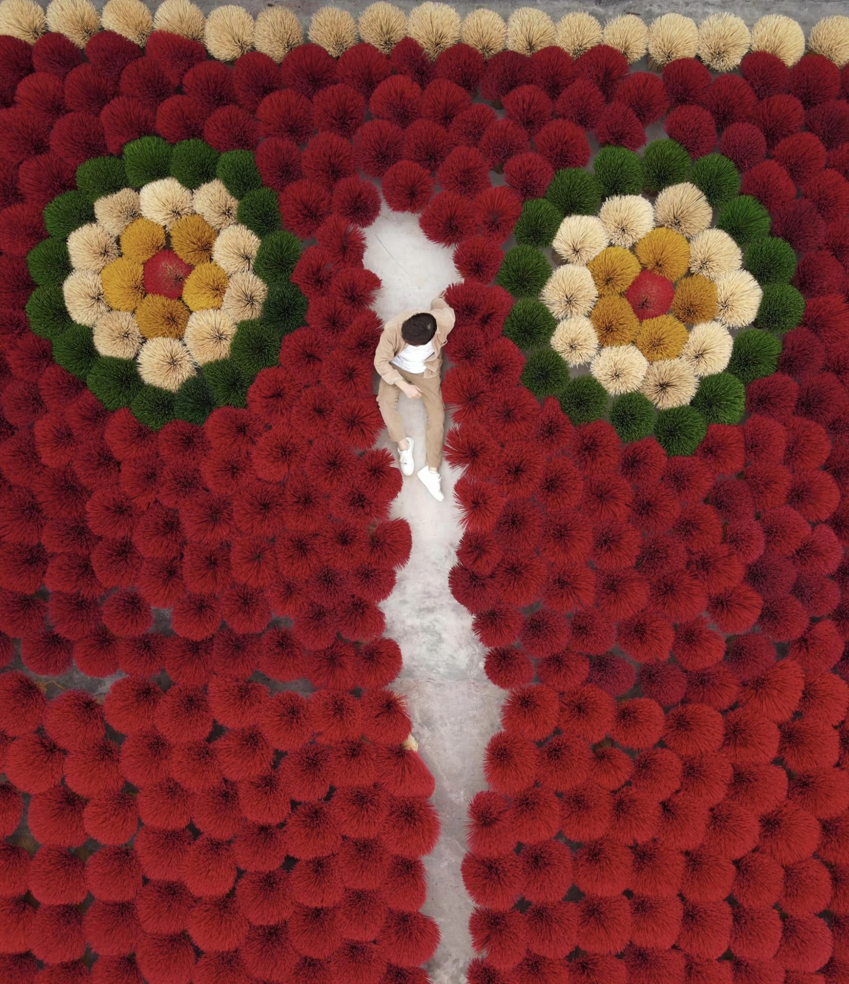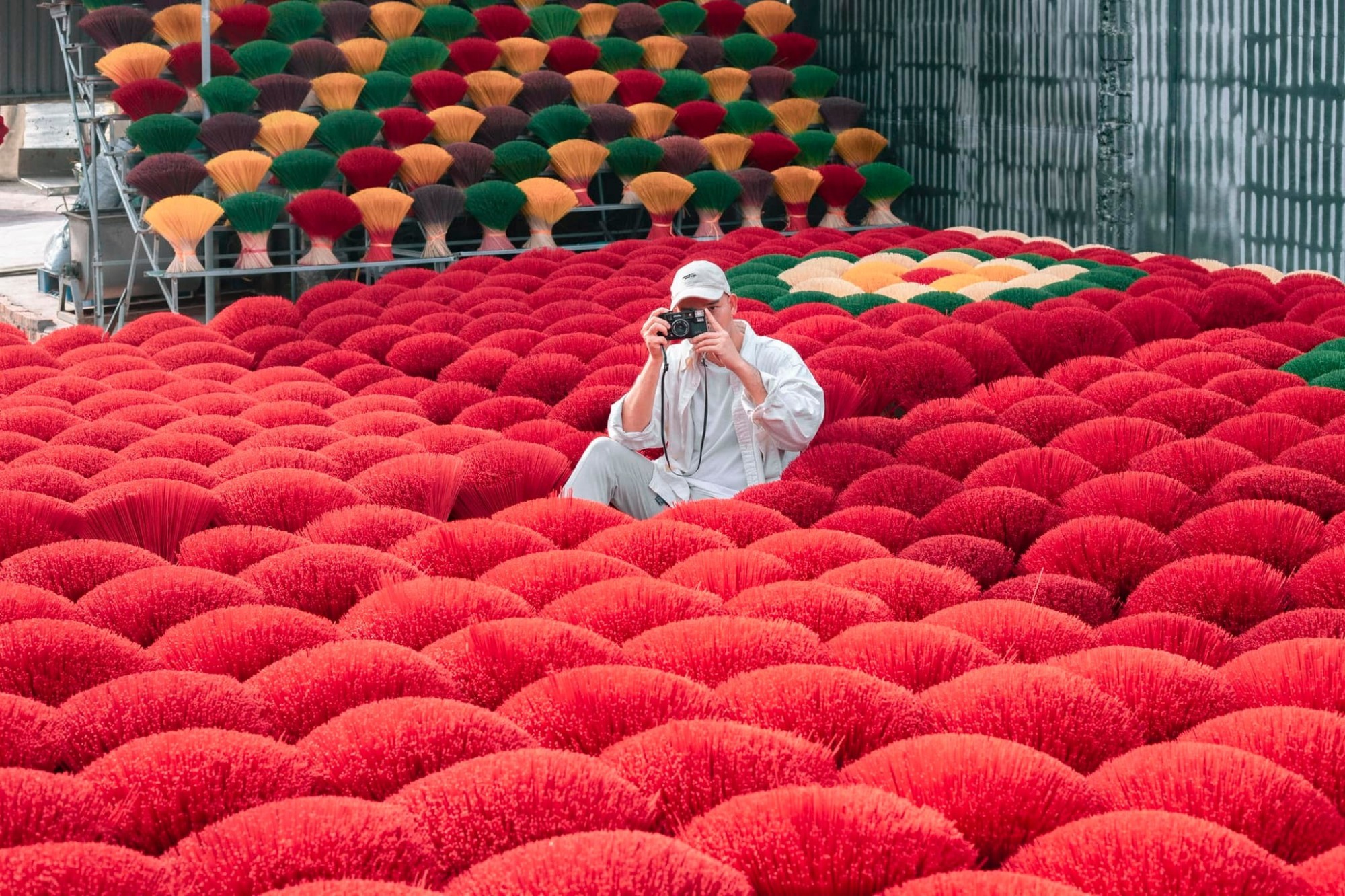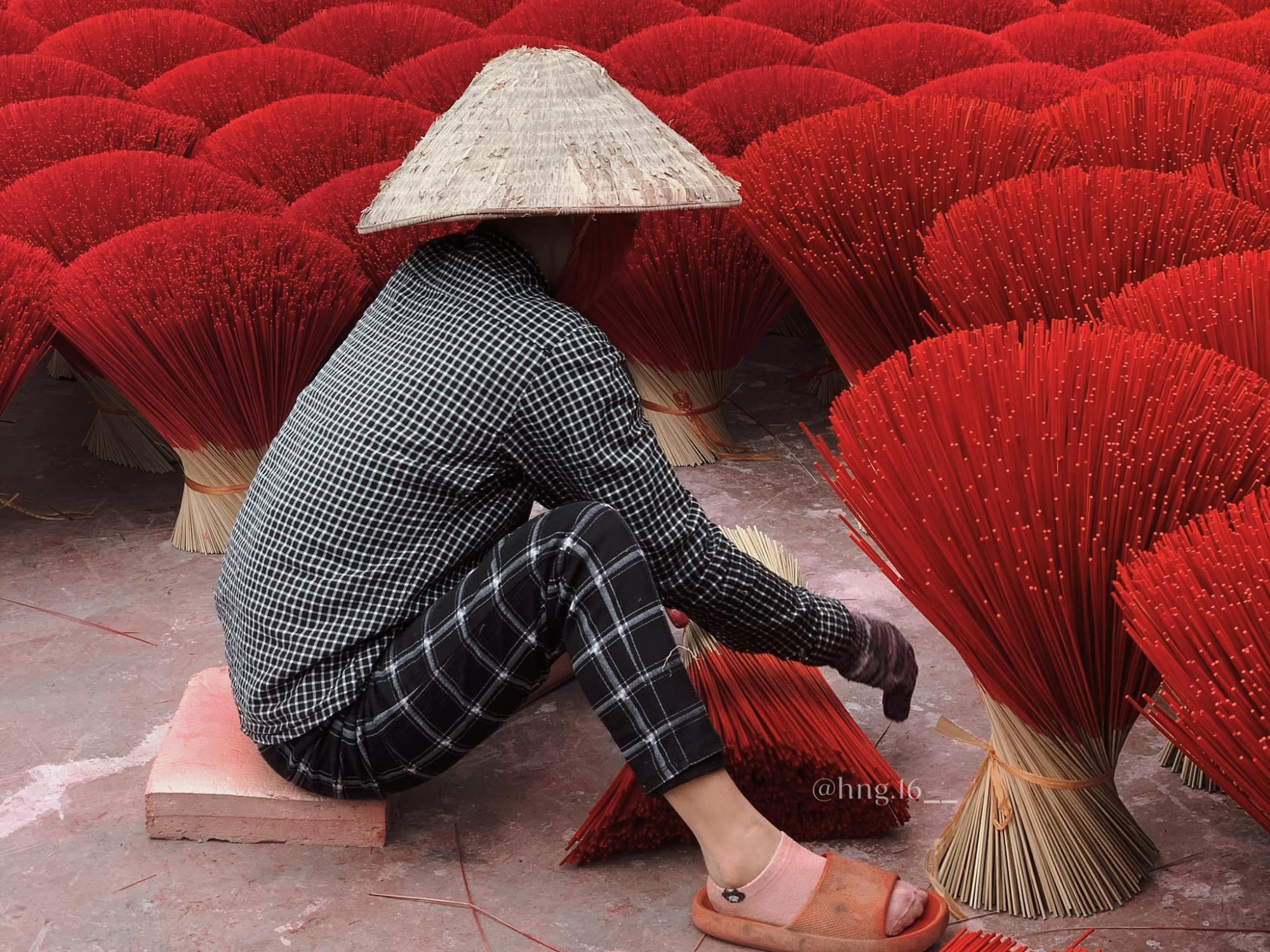 Được biết, để vào tham quan, tìm hiểu và chụp hình trong một số cơ sở sản xuất tăm hương tại đây, du khách phải mua vé với giá dao động từ 50.000 – 100.000/người. Dù chi phí khá cao, tuy nhiên theo Hoài, mức giá này có thể hiểu vì các cô chú làng nghề phải bỏ công sắp xếp tăm hương thành các background kỳ công cho khách tham quan. Sáng họ xếp hương ra, chiều lại dọn vào, ngày nào cũng lặp đi lặp lại công việc như vậy (Ảnh: Hoài Nguyễn).