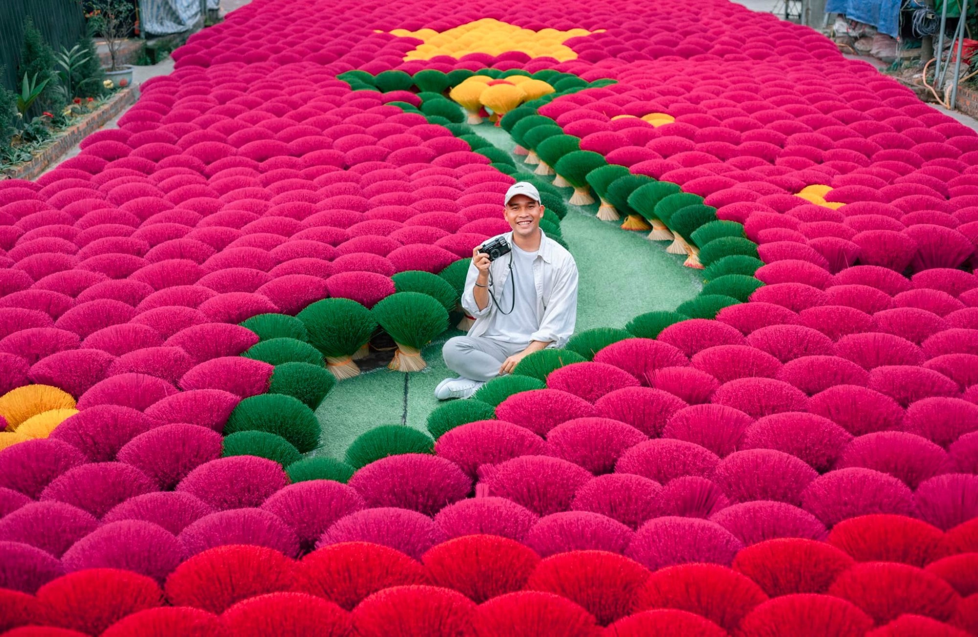 Để hấp dẫn khách du lịch hơn, một số gia đình ở đây còn dùng những khóm tăm hương tạo thành hình bản đồ Việt Nam với lá quốc kỳ cờ đỏ sao vàng rất đẹp mắt. Đây cũng là góc “sống ảo” được nhiều kols, travel blogger,… “đổ xô” về check-in (Ảnh: Blog của Rọt).