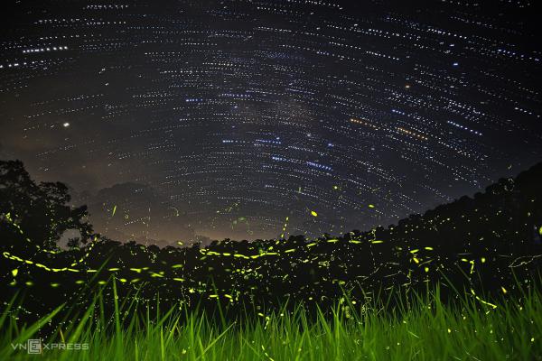 Sự chuyển động của dải ngân hà trên bầu trời kết hợp ánh sáng của đom đóm dưới đám cỏ rừng.