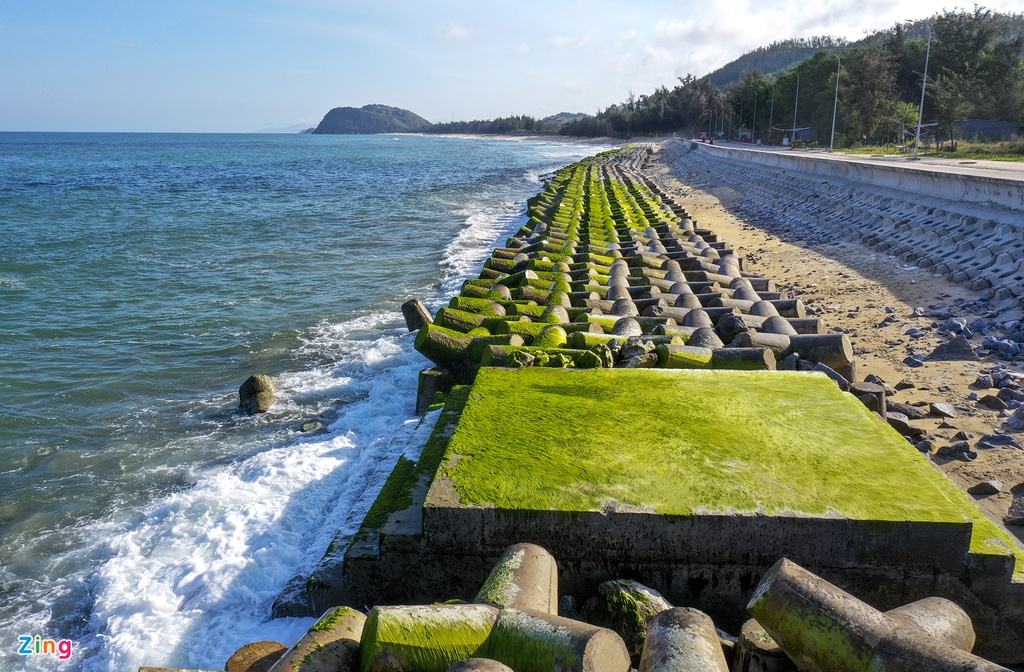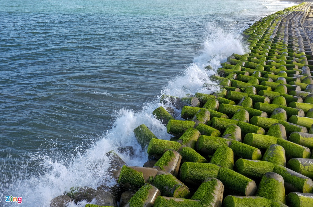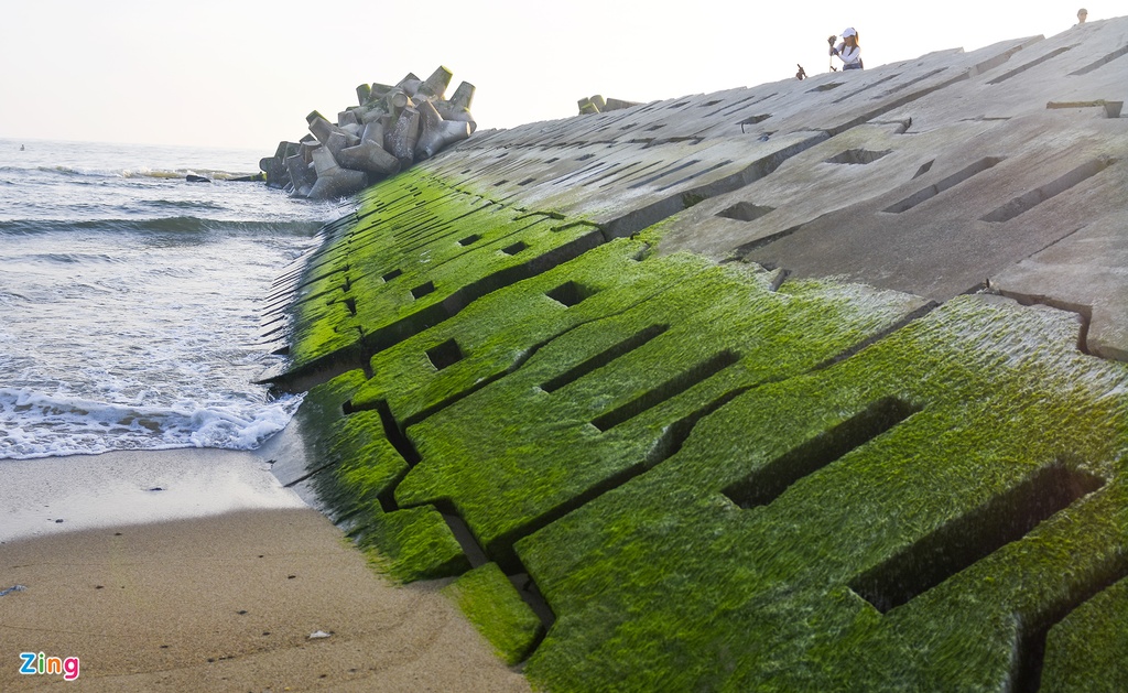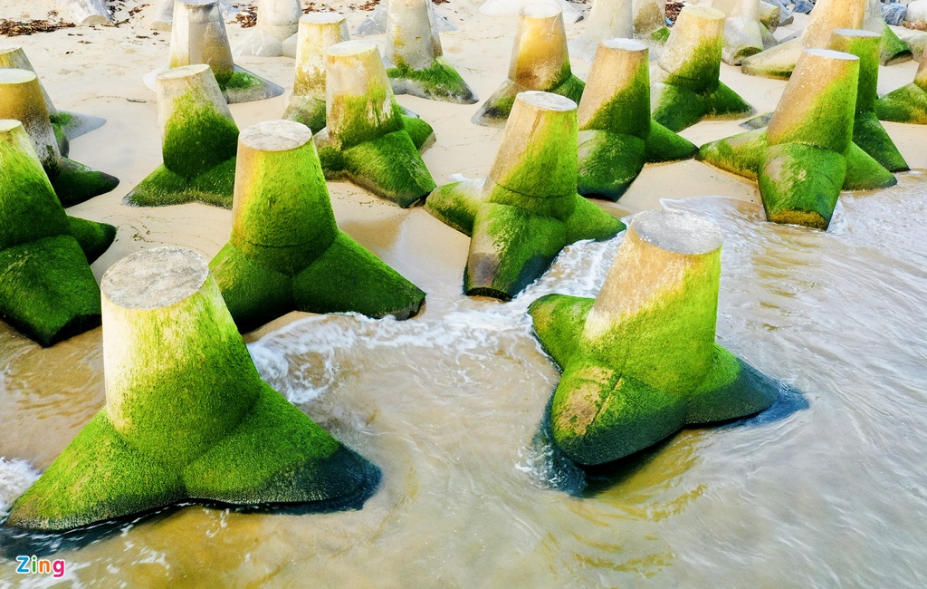 Khối bê tông accropode (cấu kiện phá sóng chống sạt lở bờ biển) nhuộm kín màu rêu, như bàn chân khổng lồ bước ra biển đón ngày mới.