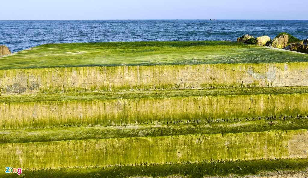 Rêu xanh phủ dày hàng trăm mét ở kè biển xã Nghĩa An, TP Quảng Ngãi.