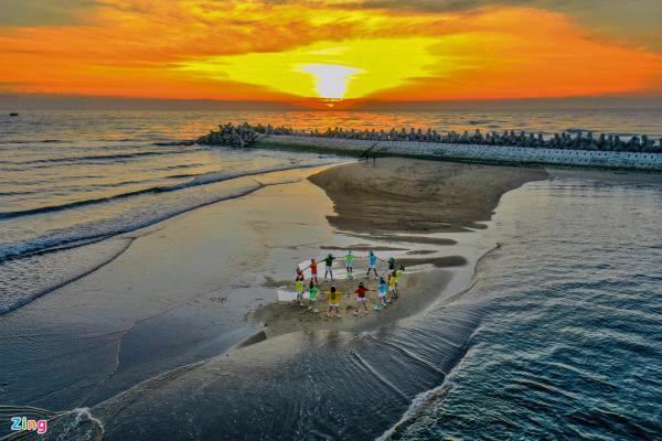 Không chỉ đón bình minh bên kè biển nhuộm màu xanh rêu, du khách còn có thể vui chơi trên các cồn cát hoặc ngồi trên bờ kè thư giãn, chiêm ngưỡng đoàn tàu cá của ngư dân địa phương rẽ sóng về bến cảng sau một đêm đánh bắt trên biển.