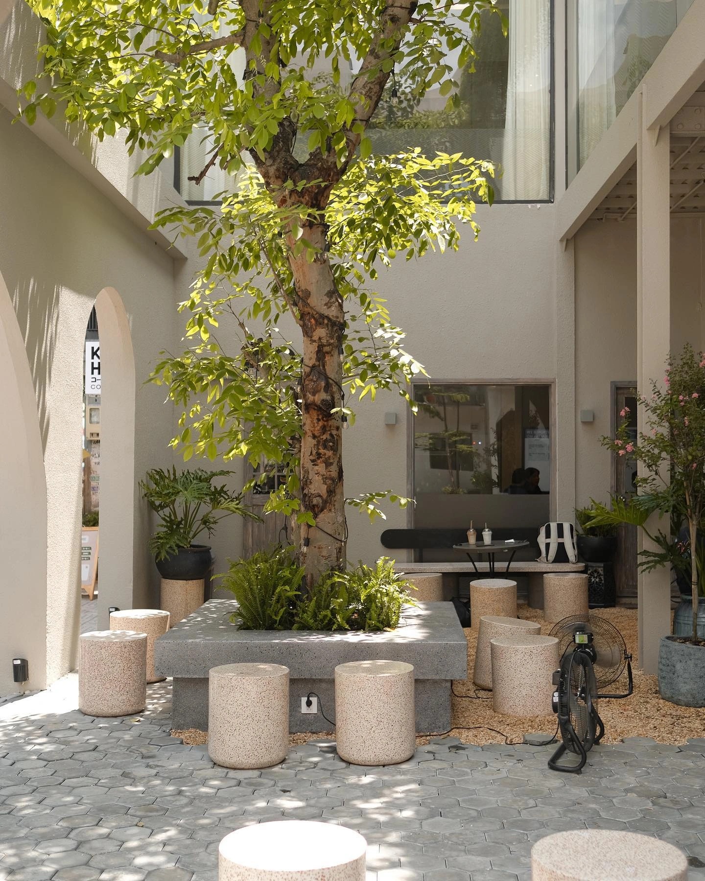 - Quán không có khu vực ngồi máy lạnh. Toàn bộ là không gian mở, khách ngồi ngoài trời thưởng thức đồ uống. Bàn ghế được làm bằng chất liệu đá, kim loại, tone màu gần với mảng tường kết hợp sàn rải sỏi nhỏ tạo cảnh quan hài hòa.