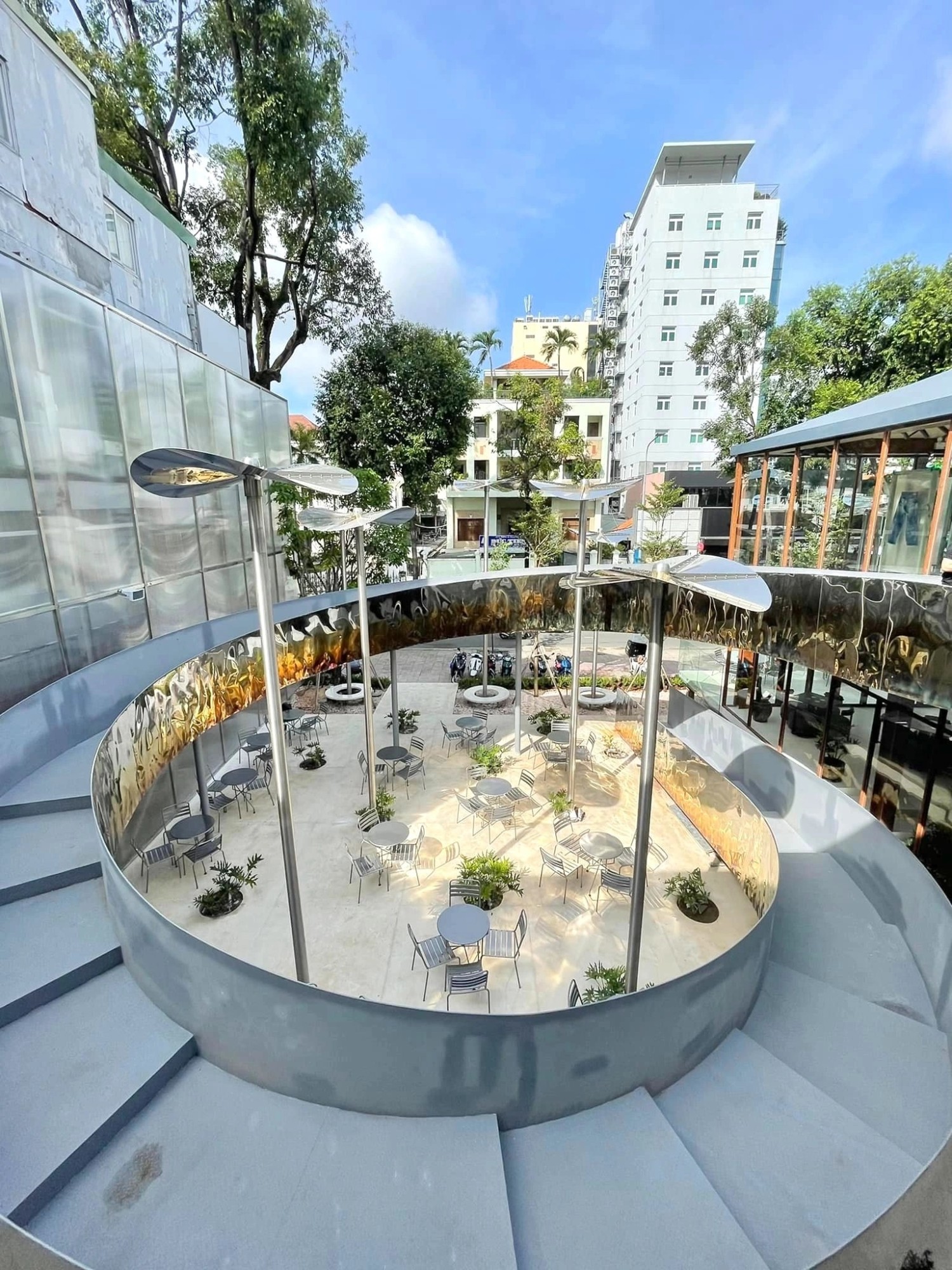- Điểm nhấn nơi đây là vòng xoáy cầu thang kết nối giữa các không gian. Lối thiết kế toát lên dấu ấn nghệ thuật đương đại. Diện tích khá rộng và thoáng, cây cối đan xen xung quanh chỗ ngồi.
