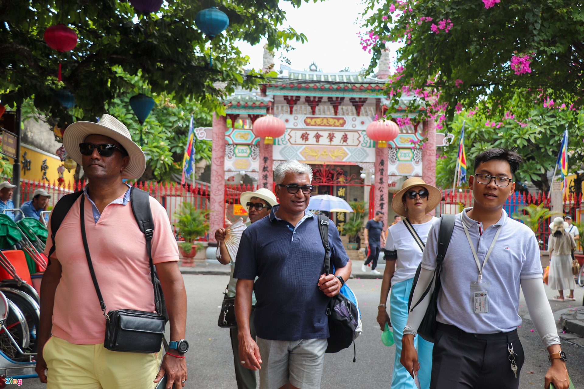"Hội An rất thú vị, đã đi du lịch nhiều nơi nhưng tôi cảm nhận sự khác biệt về văn hóa và cảnh quan nơi đây so với các nước trong châu Á. Nơi này có vẻ đẹp cổ kính xen lẫn hiện đại, tôi rất thích khi đến đây", ông Vinod (ngoài cùng bên trái), du khách người Nam Phi, cho hay.