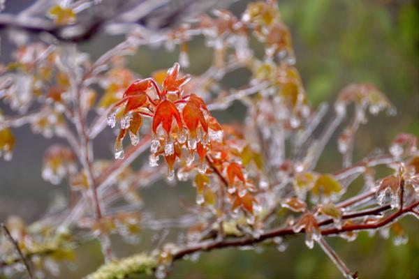 Trưa 20/2 trời quang và băng tan, đọng lại trên những cành lá một lớp mỏng. Song chiều tối trời tiếp tục mưa, gió to tạo băng dày hơn.