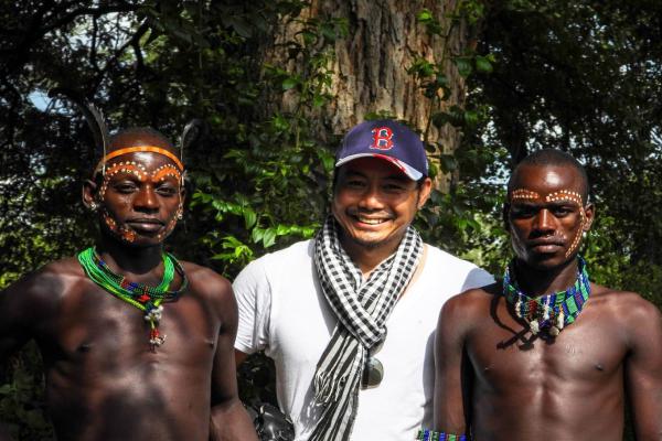 Tác giả đứng giữa 2 người đàn ông của bộ tộc Hamar. Vì thế lễ hội nhảy bò hay lễ hội trưởng thành rất được họ coi trọng. Một năm, lễ hội diễn ra vài lần và họ thường chọn địa điểm vắng vẻ để tổ chức nên ít du khách được chứng kiến. Ngay khi biết tin lễ hội sắp diễn ra bên một bờ sông, tôi đã tìm thuê một người bản địa dẫn đường và chẳng ai trong chúng tôi biết vị trí chính xác. Gần tới ngôi làng của người Hamar, chúng tôi bỏ xe tại bờ sông và đi bộ gần 10 km mới tìm thấy vị trí chính xác của lễ hội.