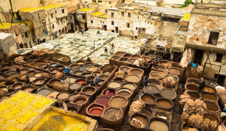 Fes là thành phố sở hữu những xưởng nhuộm da lâu đời nhất trên thế giới. Tại đây, người ta vẫn còn sử dụng những phương pháp nhuộm màu có từ thời Trung Cổ nên da thuộc mua ở khu chợ quanh khu vực này được làm hoàn toàn thủ công. Tuy vậy, mùi từ các khu xưởng nhuộm này lại khá nồng nên trước khi vào tham quan, du khách thường được cho lá bạc hà để chà lên mũi để không cảm thấy khó chịu khi tham quan.