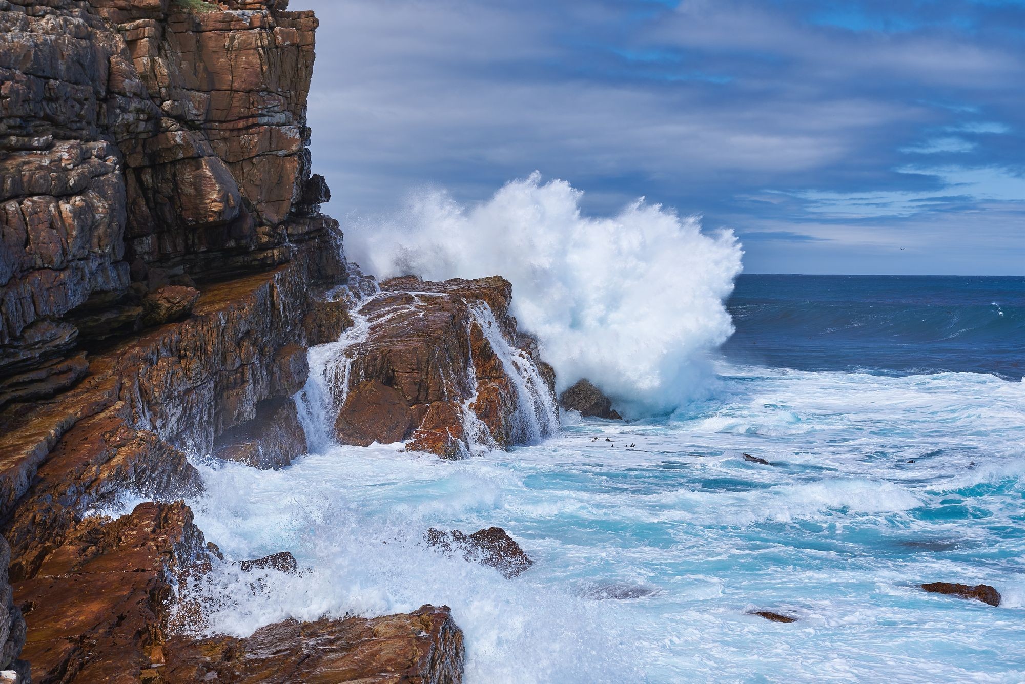 Từng ngọn sóng đập vào bờ đá tung bọt trắng xóa lên trời, tạo nên cảnh tượng hùng vĩ