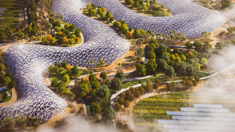 Toàn cảnh Agri Hub từ trên cao. Dự án được xây dựng ngay trên sa mạc. Baharash Bagherian, Giám đốc điều hành URB, cho biết: "Nhiều người đang hiểu nhầm du lịch nông nghiệp. Họ nghĩ đó là hoạt động thăm thú trang trại, trồng cây, hái quả. Agri Hub sẽ giúp xoá bỏ những nhận định này. Bất kể bạn là nhà bán lẻ, nông dân, hay khách hàng, kinh tế xanh dành cho mọi người".