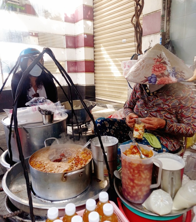 Từ 7h sáng, bà Hiệp - chủ gánh tàu hũ đường mật - luôn tay múc tàu hũ cho khách. Xung quanh gánh có đặt những chiếc ghế nhỏ cho khách ngồi ăn tại chỗ, ngoài ra còn có nhiều người mua mang đi.