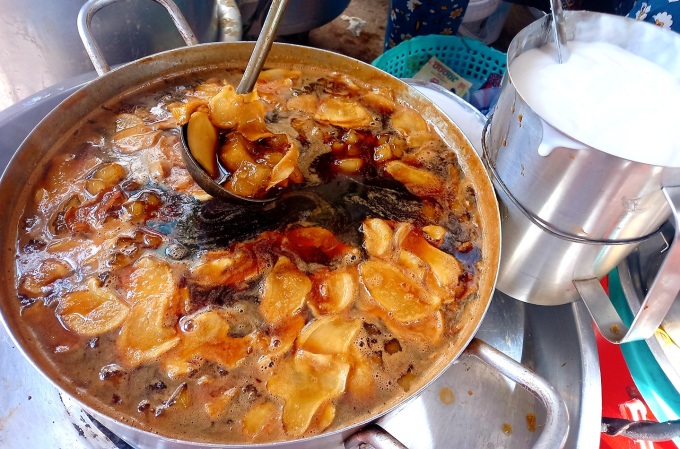 Nồi nước đường mật nấu với gừng cho màu sắc mắt mắt, thơm phức. Ảnh: Hà Lâm Để món tàu hũ thơm ngon, công đoạn nấu nước đường, cốt dừa và làm trân châu... không kém phần quan trọng. Với nước đường, bà Hiệp chọn loại đường mật để nấu cho có màu sắc đẹp, đậm vị. Nồi nước đường thơm ngon còn có thêm những lát gừng cay và phải đun nóng trong suốt thời gian bán. Trân châu được làm từ bột năng nên có độ mềm dẻo. Còn nước cốt dừa sẽ nấu sệt, vị béo ngậy. Tất cả đều được chuẩn bị sẵn ở nhà.