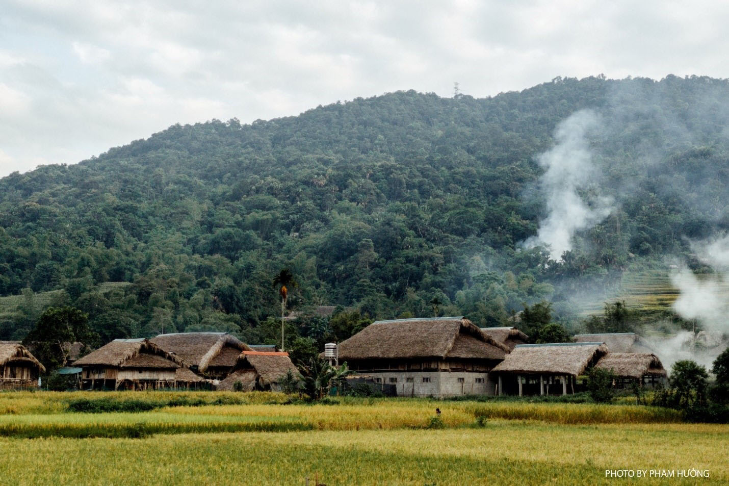 Thôn Tha yên bình với ngôi nhà sàn mái lá nằm giữa cánh đồng lúaĐặc trưng của ngôi nhà sàn ở đây là đều được lợp lá cọ. Không chỉ giúp ngôi nhà trở nên thoáng mát và thêm phần mềm mại, duyên dáng hơn mà những mái cọ khum khum đượm màu khói bếp ấy còn đủ sức gợi lên nỗi nhớ với những người con bản Tày xa xứ cũng như với những du khách đã từng đến thôn Tha.