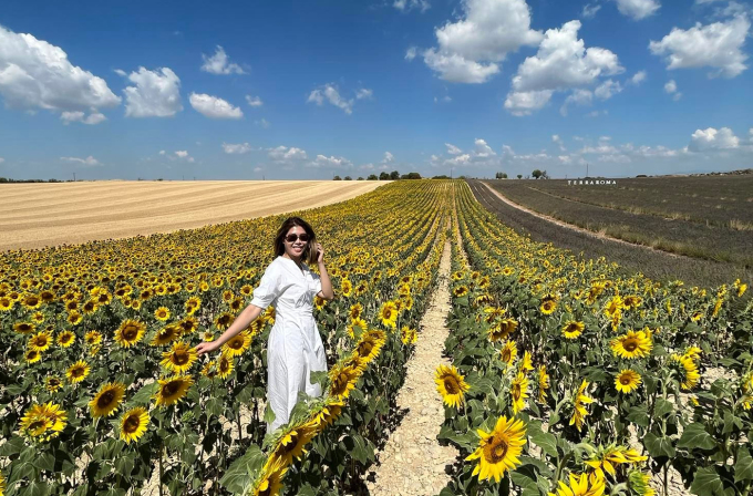 Cẩm Ly chụp ở Plateau de Valensole, cánh đồng hoa lavender nổi tiếng ở Pháp. Ảnh: NVCC Theo tỷ giá của các ngân hàng Việt Nam, để mua một euro hiện chỉ cần khoảng 23.000 đồng, so với mức 27.000 hồi đầu năm.