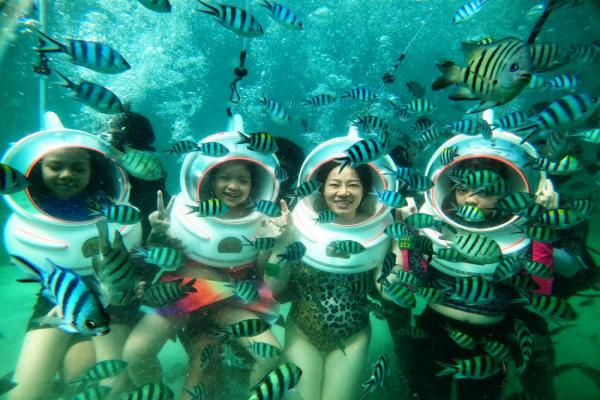 Du khách trải nghiệm đi bộ dưới biển bằng mũ đồng