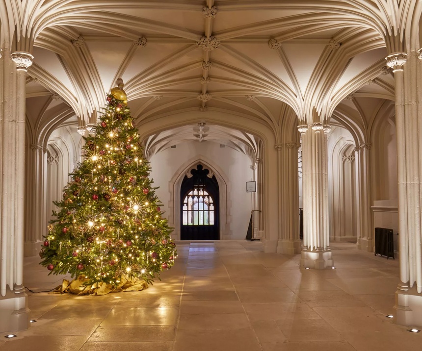 Không khí lễ hội tràn ngập ánh sáng trên những cây thông Noel sẽ không làm cho nơi đây trở nên nguy nga, lộng lẫy mà ngược lại còn rất ấm áp. Bên cạnh đó, các bức tường đá điêu khắc công phu cùng với các cột trụ cổ điển và phần trần nhà hình vòm cũng là một yếu tố thú vị không thể bỏ lỡ. Ảnh: Royal Collection Trust.