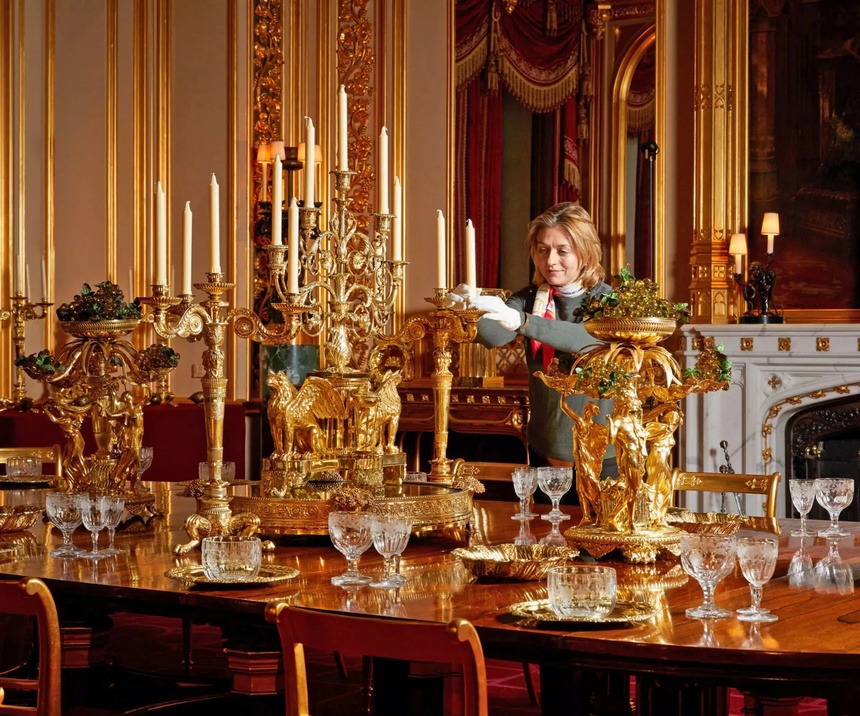Đây cũng là nơi không bao giờ “chịu dừng lại” với những ý tưởng trang trí Giáng sinh truyền thống và tất nhiên năm nay cũng vậy. Nhìn lại thiết kế phòng ăn từ năm trước, ta vẫn ấn tượng trước sự trang trọng với bộ dụng cụ ăn uống mạ bạc “Grand Service”. Cũng như chiếc bàn lớn ở trung tâm, những chiếc bàn bằng gỗ gụ viền vàng cũng được xếp dọc theo bức tường phía sau, với bức tường đối diện được trang trí bằng lò sưởi bằng đá cẩm thạch trang trí công phu và bức chân dung của Nữ hoàng Victoria. Ảnh: Royal Collection Trust.