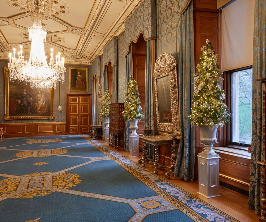 Không chỉ cây thông Noel đặt ở khắp các căn phòng, những vòng hoa tươi cũng được sử dụng dọc các hành lang, sảnh, cầu thang và cổng. Tất cả chúng đều được làm thủ công bởi nhân viên và thợ làm vườn tại lâu đài, tạo nên dấu ấn đặc biệt không thể trộn lẫn của Windsor. Ngoài ra, trong phòng trưng bày của Nữ hoàng, những cây thông Noel nhỏ hơn xếp dọc các lối đi và được thêm vào để bổ sung cho đồ nội thất bằng bạc quý hiếm. Ảnh: Royal Collection Trust.