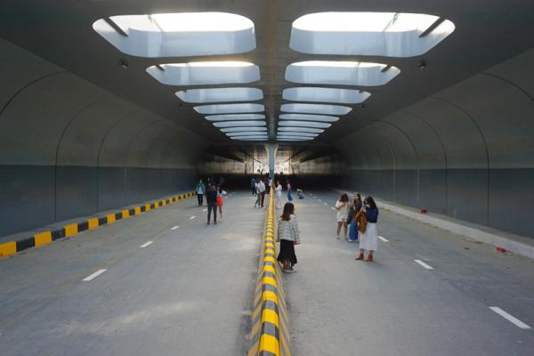 Dần hoàn thiện những công đoạn cuối cùng nhưng hầm chui với thiết kế nhiều cửa sổ trời, dài 900 m vẫn thu hút nhiều giới trẻ đến check-in, chụp ảnh lưu niệm.