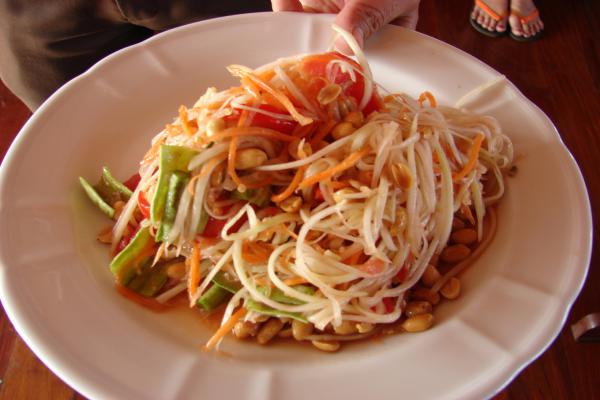 Thực tế, gỏi đu đủ xanh không chỉ có ở Thái Lan mà còn phổ biến ở các quốc gia Đông Nam Á. Việt Nam có gỏi đu đủ bò khô, người Lào có tam maak hung (ảnh) và người Campuchia có bok l'hong. Ảnh: Sandra Scott/Intltravel News