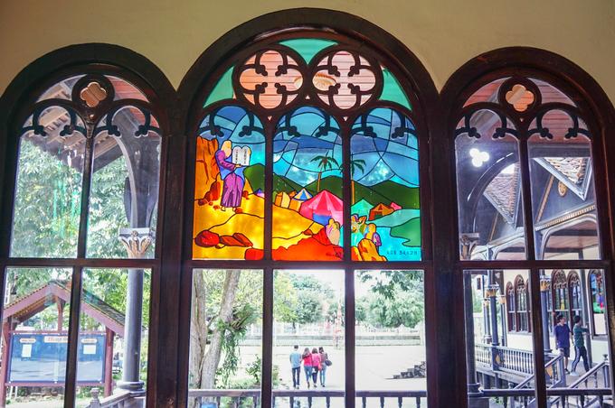 Thánh đường có nhiều khung cửa kính màu vẽ lại các điển tích trong Kinh thánh. Nhờ vậy, giáo đường vừa có thêm ánh sáng tự nhiên vừa tăng thêm vẻ rực rỡ, tráng lệ.