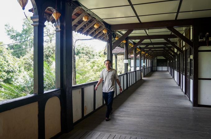 Công trình có hành lang rộng và dài với hệ thống sàn, kèo, cột, trần, cầu thang... đều xây dựng từ những cây gỗ quý khai thác ở địa phương.