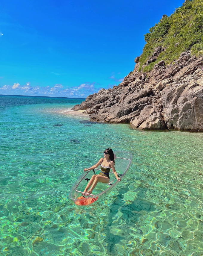 Nước trong vắt ở Hòn Trác kết hợp với kayak trong suốt khiến du khách như đang lơ lửng trên biển. Ảnh: Ngoc Ha ChuDu khách đến Côn Đảo được trải nghiệm chèo kayak trong suốt ở Hòn Trác. Chu Ngọc Hà, du khách đến từ Hà Nội, đặt tour tham quan 5 đảo và trực tiếp tham gia trải nghiệm thú vị này. "Mỗi năm mình đi Côn Đảo một lần nhưng năm nay là năm đầu mình có chuyến đi thú vị như vậy khi được chèo kayak trong suốt, đi thả rùa mà không phải mùa nào cũng có", Hà chia sẻ.