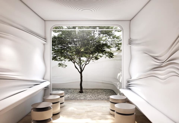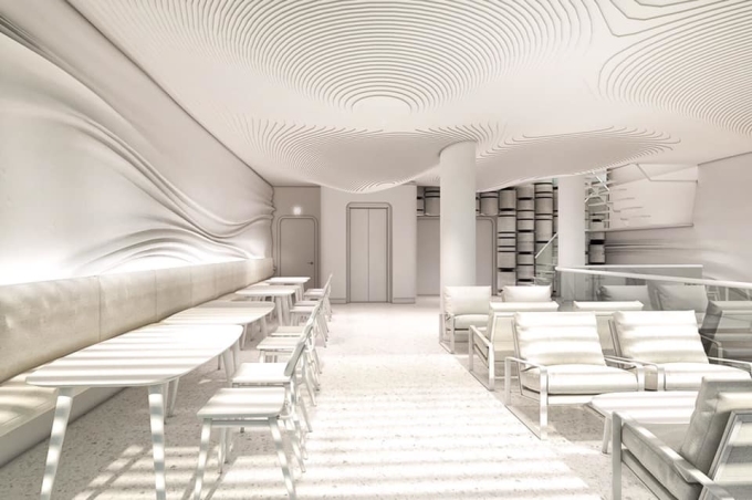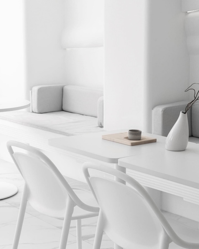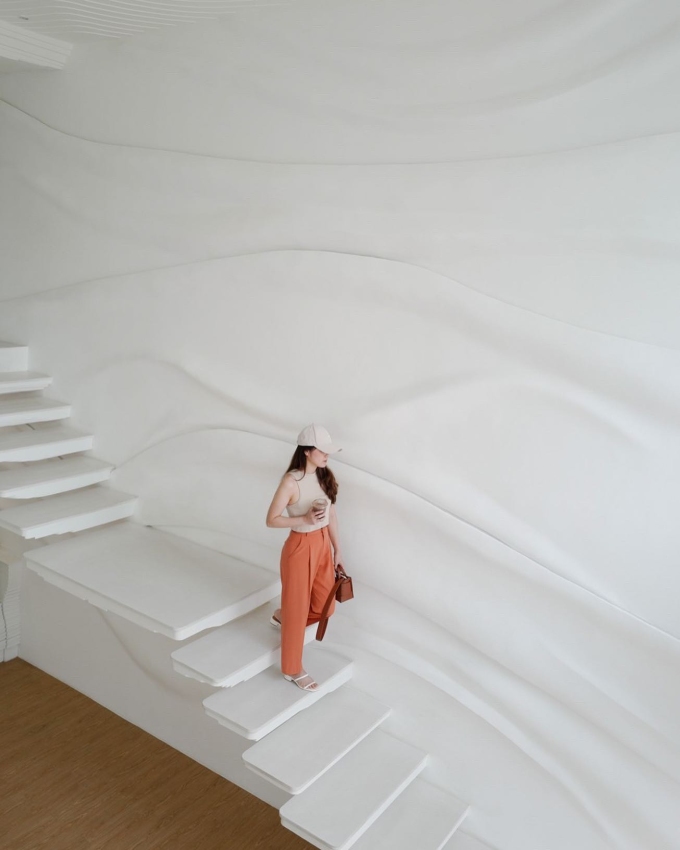 Màu sắc chủ đạo và duy nhất của quán là trắng cùng những đường vân được lấy cảm hứng từ các vệt sữa lóng lánh. Ảnh: Flat+White Cafe/Facebook