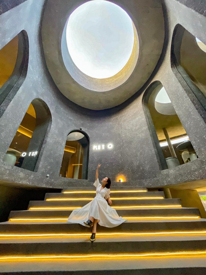 Quán cà phê mới mở này lấy cảm hứng từ ngôi sao lạnh lẽo và cô độc nhất hệ mặt trời - sao Diêm Vương. Nội thất quán được sơn màu chủ đạo là đen, kết hợp với kiến trúc đơn giản nhưng không kém phần sang trọng và độc đáo. Đó cũng là lí do ngay từ khi mở cửa, quán đã thu hút được sự quan tâm của đông đảo khách địa phương cũng như quốc tế. Ảnh: Đặng Thùy Dương